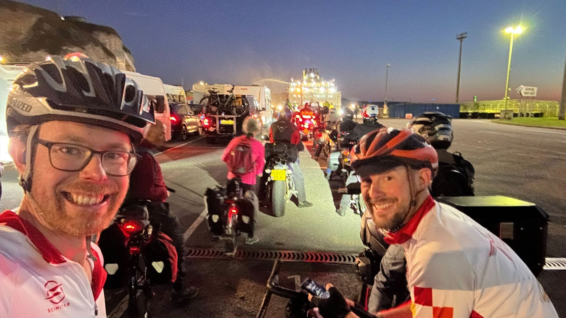 They left Paris at 12.35 CET (11.35 GMT) on Saturday 22 June, rode north, having to deal with the mid-day Paris traffic. They continued cycling north through the rolling French countryside, and into a strong headwind that they had to battle for the remaining distance of the ride. They reached the ferry port of Dieppe at 23.03 CET (22.03 GMT) with a ride time of 10 hours 28 minutes, well over two hours behind their initial schedule, and physically in quite poor shape after fighting the wind the whole ride and having to deal with a few mechanical issues along the way. Following a five-hour ferry crossing while the clock kept counting, they arrived at Newhaven at 05.00 GMT. Once through boarder control and customs, they started cycling again at 05.17 GMT.