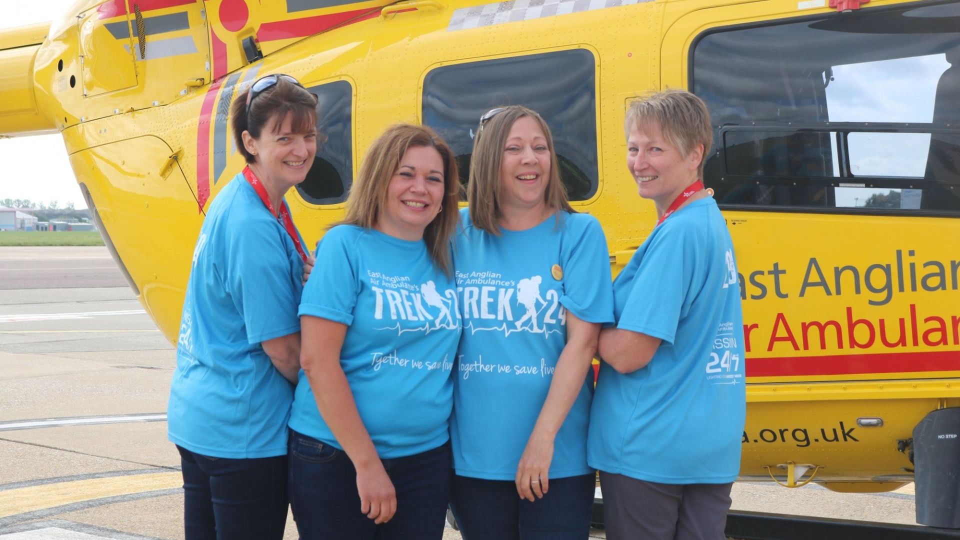 Four 4 24 – Louise Langham-Hill, Natasha Pickett, Clare Johnson and Bev Macfarlane are walking 24K as part of Trek 24 in September. The team are pictured here meeting the Anglia One Crew: Pilot Rich Anderson, Critical Care Paramedic David Killingback, Doctor Victor Inyang and Critical Care Paramedic Neil Flowers.
