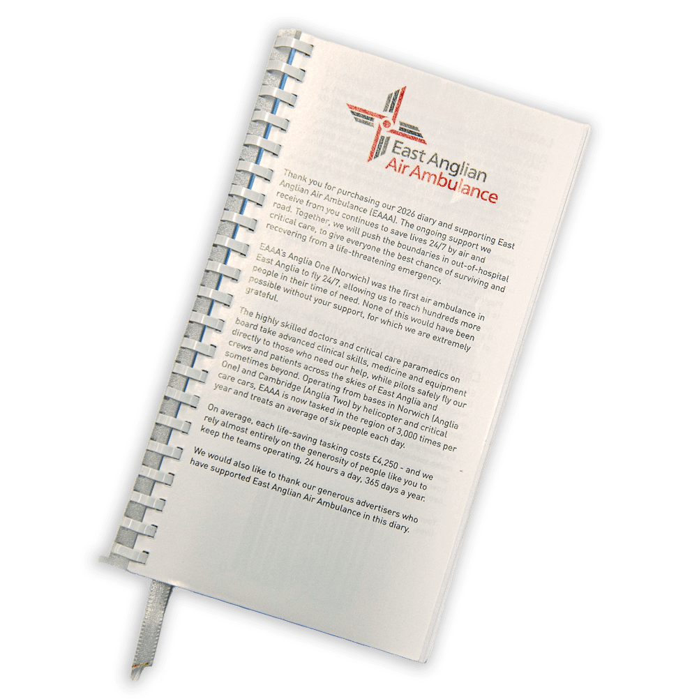 All proceeds from the sale of this diary insert go directly to the charity, helping EAAA continue providing life-saving critical care 24 hours a day, 365 days a year.