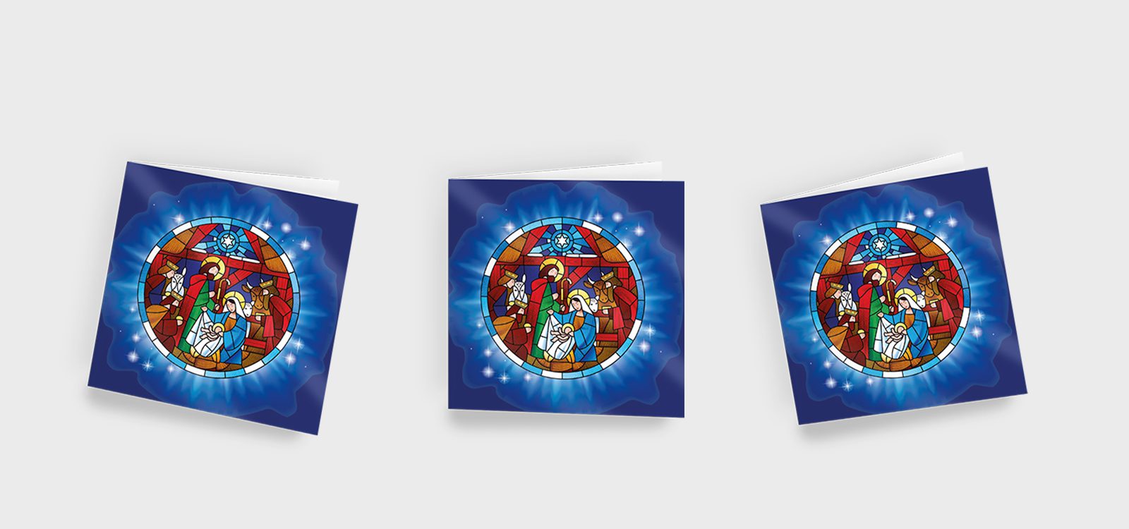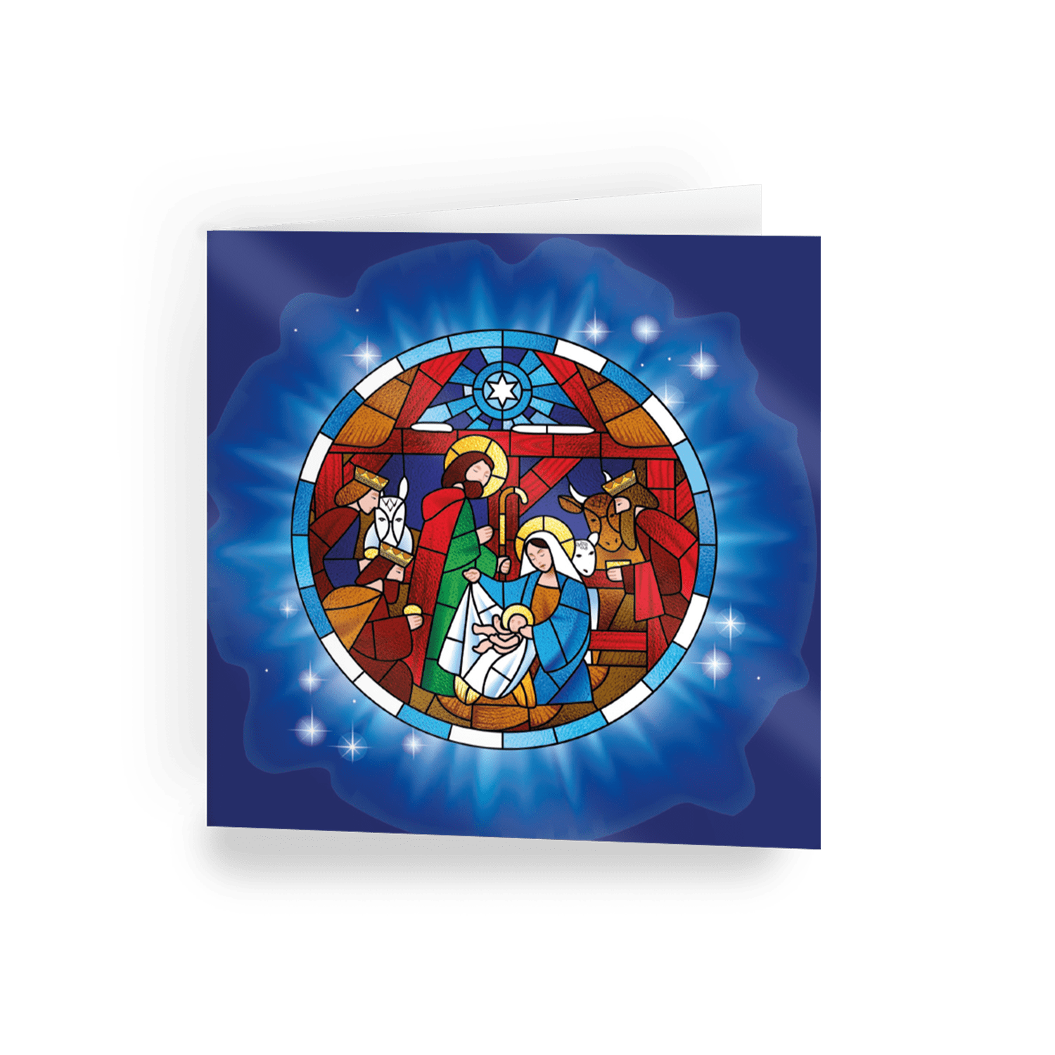 This enchanting Christmas card features a stunning stained-glass window titled "Nativity Window." The centrepiece of the design depicts the three wise men presenting their gifts to the newborn Jesus.
