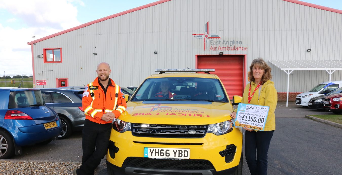 However despite a long recovery process, Carolyn made a remarkable recovery. Since her accident Carolyn has been in to meet the crew who saved her, and has now become a fantastic supporter and fundraiser for EAAA. For our Get Up and Go Yellow day Carolyn and her coffee house – The Chapel Coffee House – turned yellow for the day and raised a fantastic £1,150 for EAAA.
