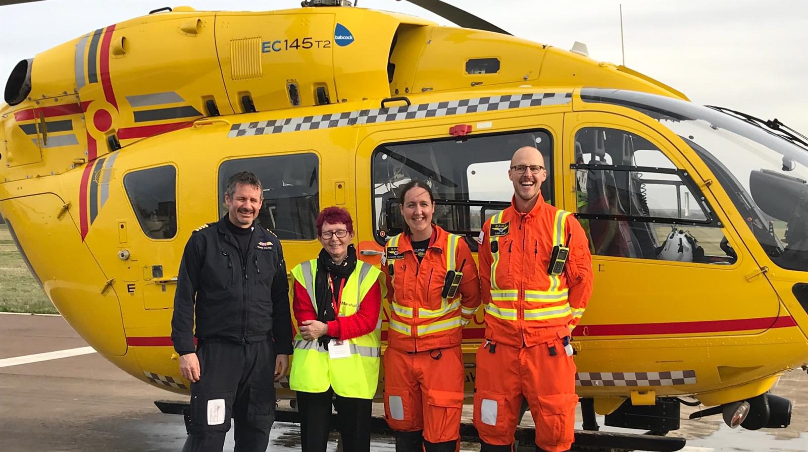 Sue Scarlett with EAAA clinicians looking inside the rear of EAAA's G-HEMC helicopter.